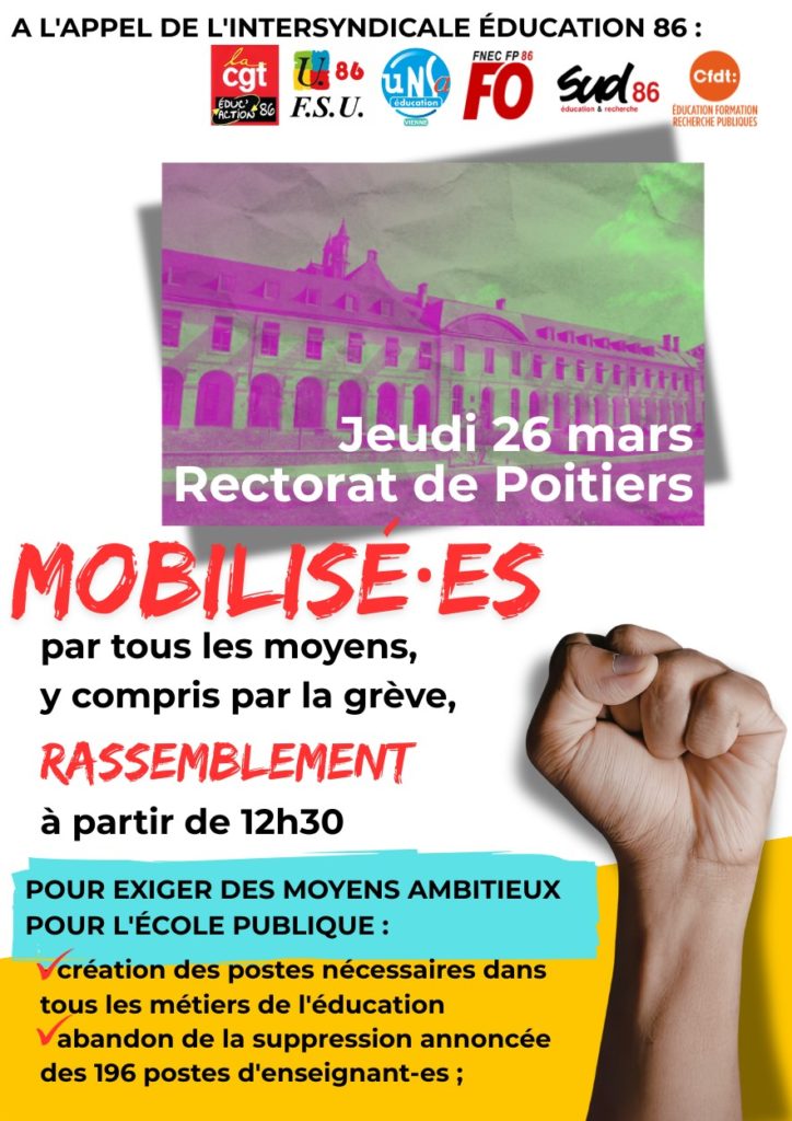 Rassemblement intersyndical devant le Rectorat de Poitiers à partir de 12h30.