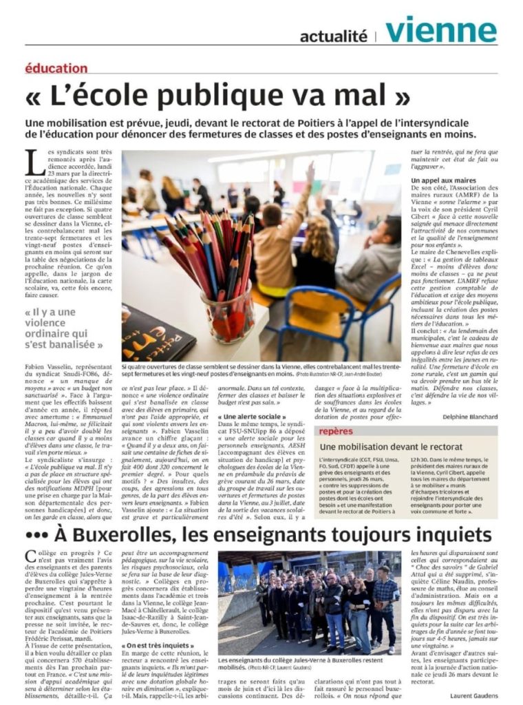 ” L’Ecole Publique” va mal ! ” – Article de la Nouvelle République